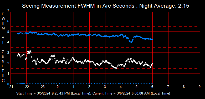 Seeing usually ranges between FWHM 1.9-2.5 arc seconds at the Zenith during typical Texas nights.